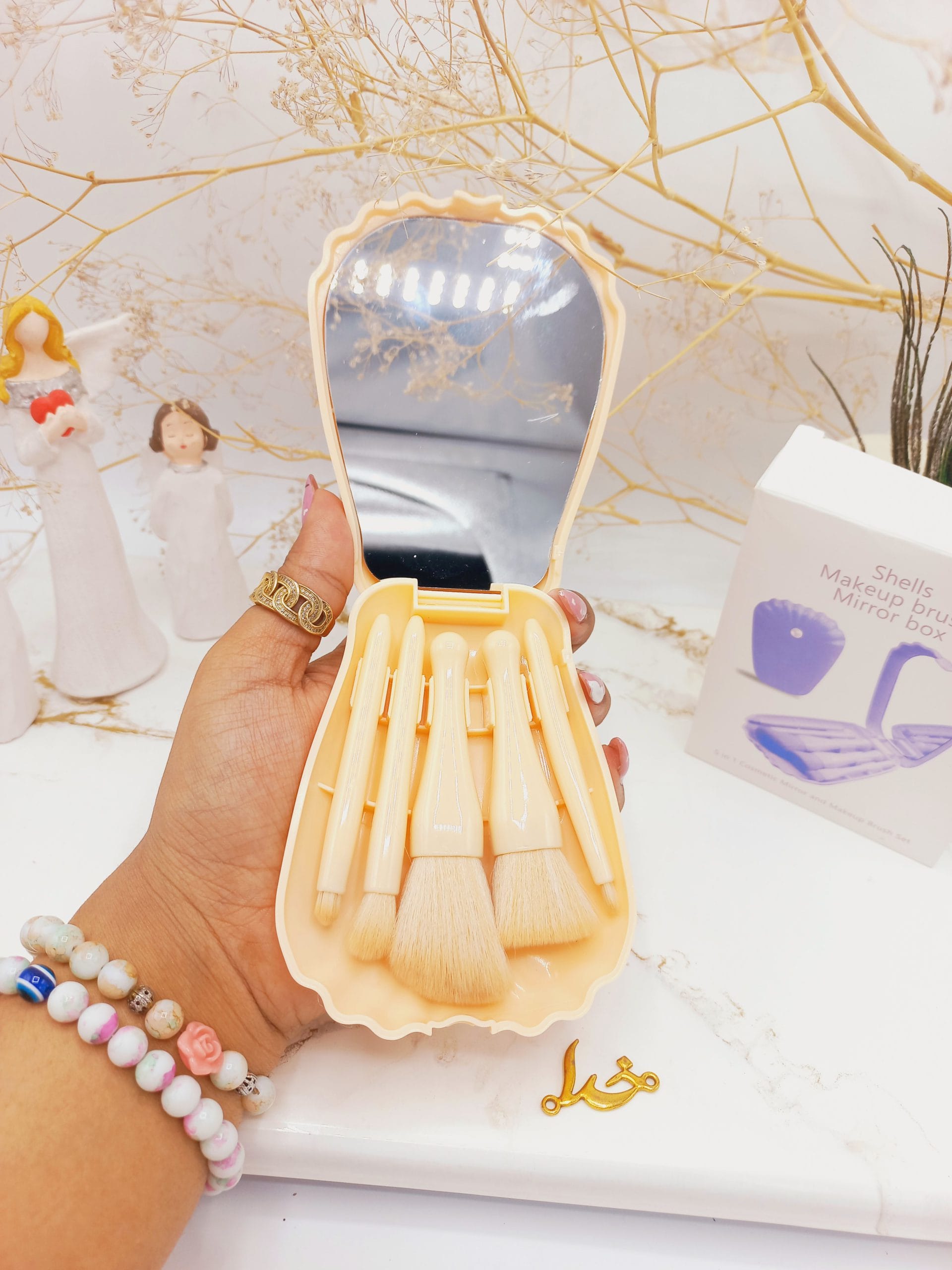 ست براش 5 تیکه باکس دار صدفی آینه دار کرم